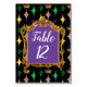 Que vous fêtiez le festival Mardi Gras ou une Fête des mariées à thème Mardi Gras, la fête de la Bachelorette, la fête d'anniversaire ou toute autre occasion, cet élégant design thématique habillera votre table dans le style jazzy Mardi Gras. Comprend des harlequins, des masques, des perles et des symboles de fleur de lis disposés dans un arrière - plan à motifs sur le noir (la couleur peut être changée via la "personnaliser") et un cadre de ton doré élaboré autour d'un arrière - plan violet pour mettre en évidence vos numéros de table. Conception composite par Holiday Hearts Designs (droits réservés).