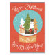 Joyeux Noël et Bonne Année design sur arrière - plan rouge avec sapin de Noël, cadeaux et bonhomme de neige.