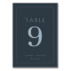This elegant table card design exudes a sophisticated and modern vibe, perfect for a chic wedding celebration. The minimalist layout features clean typography with a large, prominent number at the center, surrounded by subtle text details that add to its refined look. Set against a deep navy background, the soft gray tones create a harmonious color palette that conveys timeless elegance. Ideal for adding an air of understated luxury to your special day, this design effortlessly complements any contemporary wedding theme while allowing for personalization to suit your unique event.