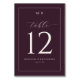 This elegant table card design features a sophisticated maroon background with a minimalist and modern aesthetic. The large, bold numerals for the table number are complemented by an understated script font that adds a touch of elegance. The overall mood is refined and timeless, perfect for a classic wedding celebration. With its clean lines and simple color palette, this design seamlessly blends into any formal event setting, ensuring your guests feel welcomed in style.