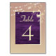 Élégant, moderne, rustique bois violet numéro de table mariage avec dentelle dorée fleurie et lampes à cordes.