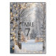 Belle carte de numéro de table de mariage d'hiver. Belle image à travers des bouleaux blancs ornés de lumières jaunes de vacances, des pins et des dérives de neige.