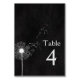 Dandelion blanc gras sur arrière - plan noir texturé avec semis flottants pour numéro de table mariage.