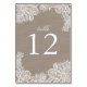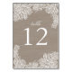 Un design élégant et vintage de burlap et dentelle mariage numéro de table par Shelby Allison.
