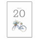 Ce numéro de table mariage d'inspiration bohème comprend une bicyclette bleue portant un panier rempli de belles fleurs bleues et blanches et une paire d'oiseaux de l'amour sur le siège. Doux, simple et élégant. Personnalisez facilement ce design avec vos informations et complétez le look avec la papeterie et les options accessoires avec ce thème. Particulièrement agréable pour les mariages de printemps et d'été. Basé sur une aquarelle originale par © Lisa Audit Art. Entourez-vous avec l'art qui fait chaud au coeur.