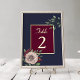 Ajoutez de l'élégance à votre fête d'automne avec cette carte de numéro de table de mariage bordeaux et or aux tons vifs, aux fleurs rousses et à la verdure sur un arrière - plan de marine. Parfait pour les mariages de automne romantiques, ce design aide les clients à trouver facilement leurs sièges tout en rehaussant votre décor de réception. Associez-le à des invitations, des menus et des panneaux assortis pour une suite de mariages d'automne cohésive.