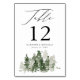 Cartes de numéro de table mariage rustique et élégante, avec vert chasseur foncé et pins d'aquarelle. Personnalisez les cartes de numéro de table de pin en ajoutant le numéro de table, vos noms et la date du mariage. Conçu pour coordonner avec notre collection Rustic Pine Forest mariage.