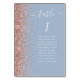 Le bord gauche de cette élégante carte de numéro de table mariage moderne comporte une bordure rose en faux parties scintillant or. Le mot "table" apparaît dans un script d'écriture blanc et blanc sur un arrière - plan bleu poussiéreux. Ajoutez les noms de vos invités qui sont affectés à chaque table.