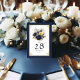Carte de numéro de table de mariage floral bleu marine et or personnalisable selon vos spécifications.