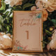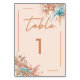 Une carte moderne et élégante de numéro de table de mariage boho, conçue avec des flancs d'aquarelle bleu et brun terre, et des lettres de script.