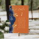 Le bord gauche de cette élégante faire-part de mariage moderne est orné d'un bouquet floral bleu marine orné de feuilles en fausse feuille d'or et parsemé de parties scintillant en faux or. Le mot "table" apparaît dans un script d'écriture manuscrite de couleur or sur un arrière - plan orange brûlé. Ajoutez les noms de vos invités qui sont affectés à chaque table.