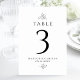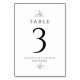 Aidez vos invités à trouver facilement leur table avec nos élégantes cartes de numéro de table personnalisées ! Le décor de table de mariage noir et blanc élégant présente "Table" avec un numéro personnalisable et les noms des mariés et la date de l'événement dans une belle police serif classique en noir sophistiqué sur un fond blanc croquant. La composition traditionnelle fraîche est embellie de feuilles botaniques décoratives. Remplissez le modèle une fois et il reproduira automatiquement le design au verso pour qu'il soit visible de plusieurs directions. Toutes les couleurs de ce design peuvent être personnalisées. Envoyez un e-mail à invitationsuites@gmail.com pour les questions ou les demandes de couleurs personnalisées.