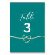 Calligraphie manuscrite simple, minimaliste, élégante, moderne et élégante Numéro de table turquoise pour mariages avec coeur de corde or.