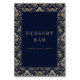 This is a vintage style image featuring an elegant dessert bar invitation. The deep navy background contrasts beautifully with the intricate gold floral border, creating a luxurious and sophisticated look. The text "DESSERT BAR" in classic serif font commands attention, while "PLEASE TAKE A TREAT!" adds a warm, inviting touch. Perfect for adding a touch of elegance to any event, this design inspires feelings of indulgence and celebration.