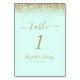The top edge of this elegant modern wedding table number features a gold faux glitter design. The customizable text combines gold-colored handwriting, copperplate and italic fonts on a mint green background.