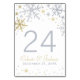 Le design de la carte numéro de tableau présente des flocons d'argent et d'or brillants avec une apparence texturée de parties scintillant et un texte monogramme de mariage personnalisé. Elégant thème blanc d'hiver merveilleux.