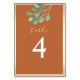 Ce numéro de table associe l'élégance rustique à une touche moderne. Présentant un feuillage d'eucalyptus à l'aquarelle dans des tons luxuriants et apaisants, et accentué de teintes sophistiquées d'or et d'orange brûlé terracotta, il respire le charme intemporel. La calligraphie simple ajoute une touche de grâce, ce qui en fait un ajustement parfait pour des noces chic et botaniques.