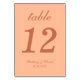 Un simple numéro de table mariage pour un jeu de couleurs mariage pêche et terre cuite. C'est juste du texte marron en terre cuite sur un arrière - plan de pêche. Tout sauf le numéro lui-même est écrit dans un élégant script calligraphique.