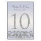 Ce design moderne de carte de table présente des accents de parties scintillant en faux argent avec un arrière - plan périwinkle. Parfait pour les mariages élégants et modernes. Les cartes de numéro de table vont jusqu'à 30.