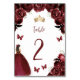 Ces jolies cartes de numéro de table de quinceañera comportent une bordure de fleurs d'aquarelle bordeaux sur un arrière - plan blanc. Une tiare dorée, une fille aux cheveux foncés en robe de princesse bordeaux et de petits papillons bordeaux ornent le texte. Le mot "table" et le numéro apparaissent dans le script d'écriture manuscrite bordeaux.