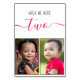 Une façon moderne et plus originale de personnaliser vos numéros de table avec des photos d'enfance de mariée et mariée à l'âge de ce nombre (la valeur par défaut est deux). Les photos d'une petite fille (la mariée) et d'un petit garçon (le marié) sont dans des cadres noirs, dans la moitié inférieure. Dans la partie supérieure, il y a le message "quand nous étions deux" avec l'âge écrit dans un script d'écriture fuchsia rouge et le reste ci-dessus, en casquette noir plus petit (lettres). Les photos de deux petits bambins noirs sont de Pixabay et sont gratuites pour un usage commercial. La petite fille noire avec des rubans fuchsia est de Cheryl Holt et le petit garçon noir en t-shirt fuchsia est de Nidhil 007.
