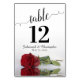 Ces belles cartes de numéro de table faciliteront la recherche de sièges à votre réception de mariage. Dispose d'un design magnifique avec la calligraphie en dentelle et une seule rose rouge couchée sur son côté avec des vagues ondulées et des reflets. Il y a de la place pour les noms du couple et la date du mariage.