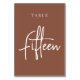 Cartes numériques simples et chic en couleur terre rouille brun et blanc faire une déclaration élégante à votre mariage ou événement. Le design comporte "table [nombre]" dans un mélange de sérigraphie classique et de lettres manuscrites. Le design se répète de part et d'autre. Cartes numérotées individuellement vendues séparément; commandez chaque numéro de table individuellement de notre collection.
