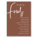 Cartes numériques simples et chic en couleur terre rouille brun et blanc faire une déclaration élégante à votre mariage ou événement. Le design comporte "table [nombre]" dans un mélange d'écriture serif classique et manuscrite, avec des noms d'invités individuels en dessous. Le design se répète de part et d'autre. Cartes numérotées individuellement vendues séparément; commandez chaque numéro de table individuellement de notre collection.