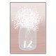 Une carte de place mariage numéro de table avec un pot en maçon de l'illustration de la respiration de bébé sur un arrière - plan d'une aquarelle d'ombre blush inspiré.