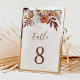 Modern bohemian style wedding table number signs featuring watercolor flowers and fall leaves in earthy tones like rust brown, burnt orange and terracotta. Perfect choice for autumn weddings.