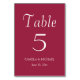Guidez vos invités de mariage à leur table avec cette carte de numéro de table de style simple qui comporte des lettres blanches stylisées sur un arrière - plan tendance, couleur rouge vin. Le design est de chaque côté de la carte. Modifiez votre carte pour modifier le numéro de table, le nom du couple de mariages et la date. Commandez les cartes séparément pour chaque numéro de table.