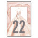 Ajoutez une touche d'élégance à votre événement avec ces cartes de numéro de table à l'aquarelle et or rose, conçues pour correspondre à notre collection de robes à l'aquarelle et or rose. Avec une illustration de robe de mariée fluide entourée d'aquarelle marbrée et d'accents de feuille d'aluminium, chaque carte affiche un grand numéro gris chaud niché dans la jupe de la robe. Parfaites pour les mariages, les douches de mariée et les quinceañeras, et faciles à personnaliser avec le modèle inclus !
