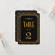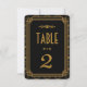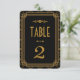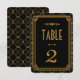 Ces numéros de table présentent une palette de couleurs noire et or, un cadre géométrique, des motifs géométriques et d'autres détails stylistiques inspirés de l'Art Déco et des années folles. Vous pouvez personnaliser les champs de texte d'exemple à votre goût.