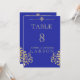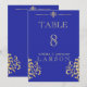 Un élégant numéro de table de mariage en damas or et bleu royal riche. Cette invitation fait partie d'un ensemble.