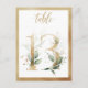Belle carte de numéro de table avec un motif botanique - une illustration aquarelle de feuillage vert et numéros à effet doré. Table 13. Veuillez vérifier tous les numéros disponibles