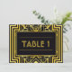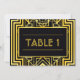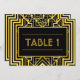 Ces numéros de table présentent un cadre géométrique complexe, des motifs géométriques, une palette de couleurs noir et or, et d'autres détails stylistiques inspirés de l'Art Déco et des années folles. Vous pouvez personnaliser les champs de texte d'exemple à votre goût.