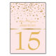 Cartes de numéro de table contemporaines or et rose pour votre mariage sophistiqué. Arrière - plan rose pâle avec faux confetti en feuille d'or sur la moitié supérieure. Un séparateur or métal est centré entre les noms de mariée et de mariée en écriture élégante, avec un nouveau nom de famille dans l'ombre dorée et un numéro de table en or gras. Identique de l'autre côté. Ajoutez chaque numéro de table séparément à votre panier Zazzle.