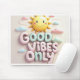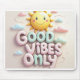 Pastellfarbene Blasen-Buchstaben: NUR GUTE VIBES. Über dem Text, eine lächelnde Cartoon-Sonne, mit Glitzern und winzigen Wolken rund. Weiche Farbtöne auf weiß. Ein sonnendurchflutetes Design, um das Zimmer zu heben.