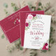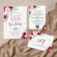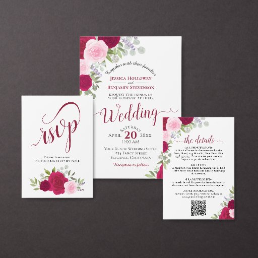 Diese wunderschöne, schicke Hochzeitseinladung mit einer Fülle von handgemalten Aquarellfarben-Rose in Magentatönen, heißen Rosatönen und Blüten, zusammen mit Eukalyptus-Blätter Gartengrün. Die Überschrift ist in extravaganter Schrift geschrieben und lautet: Nichts Extravagant, Just Liebe! Auf der Rückseite befindet sich ein Detailbereich mit einem individuell anpassbaren QR-Code, in dem Sie Ihre Gäste auf eine Webseite für weitere Informationen und/oder zu UAWG weiterleiten können. Es ist mit einem Bouquet der gleichen Blume mit einem fließenden Satin-Bogen auf einem lila, marmorierten Hintergrund ausgestattet.