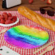 Schöne Regenbogenfarben und Herzen mit den Worten Just Married und den Namen des neuen Ehepaares und ihrem Hochzeitstag.
