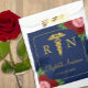 Nurse graduation with pink and red roses against a navy blue background. Gold caduceus and script typography.
