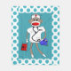 Nurse Sock Monkey Fleece Blanket. Socken Affe mit Krankenschwester Kappe und Stethoskop. Der Hintergrund ist blau mit einem blau-weißen Polka Punkt Rand. .