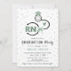 Nursing shool class of 2026 stethoscope sage green RN graduation Invitation. This feminime girlyRegistered Nurse graduation invitation features a black stethoscope with a graduation cap, a heart, a coquette bow, confetti and the initials RN in green. The back includes a pattern of the 'RN" initials.