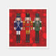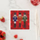 Weihnachts Nutcracker Trio - Drei Nutcracker, stehend nebeneinander auf einem roten Weihnachtsbummmuster. Der erste Nusscracker ist in Blau und Weiß mit Goldverzierungen gekleidet. Der Muskatnussknacker in der Mitte ist in Rot und Gold mit Goldverzierungen gekleidet. Der dritte Nussknacker ist in Grün und Weiß mit silbernen Schmuckstücken gekleidet. Jeder dieser Nussknacker ist separat auf verschiedenen Zazzle Geschenken und Produkten erhältlich. Wählen Sie eine beliebige Zazzle Papierserviette aus.