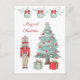Die Weihnachtspostkarte enthält eine Aquarellbilder von Nutcracker, Weihnachtsbaum, Baubles und Geschenken. Auf der Rückseite - Weihnachtsernährungsmittel und Rockpferd