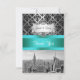 NY City Skyline BW B3 Damask F2 - Merci Personnalisable Invitations et accessoires avec une vue iconique de l'horizon de New York City du sommet du 30 Rockefeller Center, avec une photo en noir et blanc de l'Empire State Building, Lower Manhattan y compris le World Trade Center. Il présente également un motif damassé noir contre un arrière - plan gris argenté dégradé et un ruban turquoise. Il dispose également d'un étiquette à dégradé blanc dans un cadre argenté. Ce produit fait partie d'une suite de conceptions assorties qui sont facilement personnalisables pour de nombreuses occasions et événements. Si vous avez besoin de cartes RSVP assorties, notes de remerciements, timbres, magnets ou autres accessoires, veuillez consulter nos autres annonces. Si vous ne voyez pas un produit correspondant qui vous intéresse, ou si vous souhaitez voir ce design dans différentes couleurs ou avec différentes photos NYCisMyMuse que vous voyez dans notre magasin, veuillez nous contacter et nous serons heureux de vous accueillir. Veuillez noter qu'il s'agit d'une conception graphique et qu'elle ne contient aucun tissu, métal ou gaufrage réel.