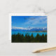 Postkarte der Südinsel Neuseelands mit dramatischen Bergen, die von einem kristallblauen See und Bäumen heraufragen.