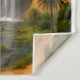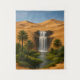 A captivating artwork depicting a cascading waterfall emerging between golden sand dunes, surrounded by lush palm trees and a vibrant green oasis. The painting reflects the contrast of nature between arid desert and flourishing greenery, creating a serene scene that transports the viewer to a world of tranquility and calm, where sand and water meet in stunning visual harmony.