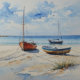 "Ocean Retreat". Ruhige Wellen umspülen das Ufer dieser friedlichen Seenlandschaft, wo die Erholung auf dem ruhigen Sand unter einem noch blauen Himmel liegt. Eine farbenfrohe Wasserfarbe in sanfter Blues und Sandfarben.