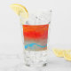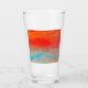 Ein abstraktes Design eines Ozeansonnenuntergangs mit kühnen Farben in Rot, Orange, Cyan, Blau und Beige.